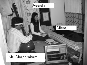 5. An example of music therapy Simultaneously measuring brain waves of Sitar player Mr. Chandrakant and a client. Measuring unit is placed at the left frontal portion of the fore head Measuring method: