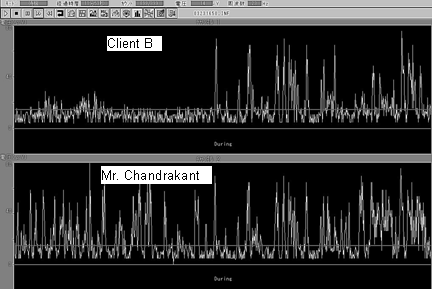 Lower portion: Brain waves of Mr. Chandrakant Upper portion: Left Client A Right Client B Horizontal axis: Time (Full-scale 15 min.) Vertical axis: Strength of Alpha waves (Voltage µV maximum voltage 80 µV ) Synchronous phenomenon was seen after 10 minutes of sitar playing. Average value of alpha waves (Beta waves)